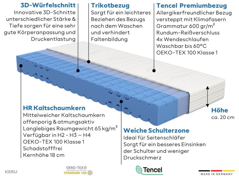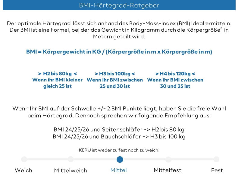 Die KERU ist ideal, wenn Sie tendenziell weicher liegen wollen. Sie ist etwas weicher als Siro Gel (Höhe 20cm) und viel weicher als Firmy (Höhe 20cm) und kann aufgrund der gleichen Höhe sehr gut mit diesen Matratzen kombiniert werden.