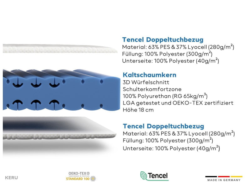 Die KERU Kaltschaummatratze sollte für den besten Liegekomfort mit einem 44-Leisten-Lattenrost (z.B. Nimbo) oder einem Tellerlattenrost (Z.B. Cirro) verwendet werden.