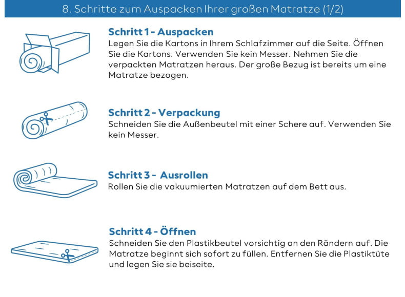 - Wir liefern die Matratze kompakt gerollt und vakuumiert im Karton mit DHL Paket.