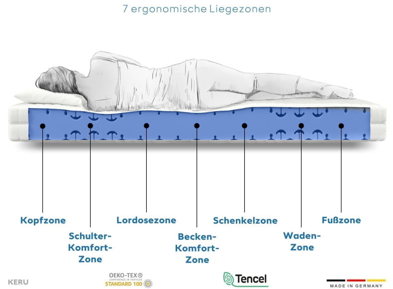Die KERU Kaltschaummatratze sollte für den besten Liegekomfort mit einem 44-Leisten-Lattenrost (z.B. Nimbo) oder einem Tellerlattenrost (Z.B. Cirro) verwendet werden.