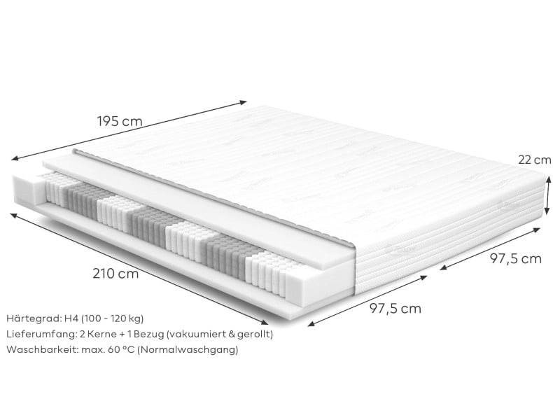 - 2 Kerne: Ab 160cm Breite liefern wir 2 Kerne in einem großen Bezug. Keine Sorge Es entsteht keine Besucherritze.