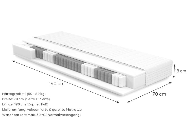 Die Roy Matratze ist eine mittelfeste 7-Zonen-Taschenfederkernmatratze mit einer Höhe von 18 cm. Sie verfügt über robuste 240 Federn/m² (480 F/2m²) und ist aus angenehmen Komfortschaum gefertigt. Die Matratze ist OEKO-TEX 100-zertifiziert, d.h. sie wurde auf Schadstoffe getestet und ist sicher für Mensch und Umwelt. Außerdem hat sie ein hervorragendes Preis-Leistungs-Verhältnis, eine gute Punktelastizität und einen langlebigen Taschenfederkern. Das Ergebnis ist ein sehr gutes Schlafklima.
