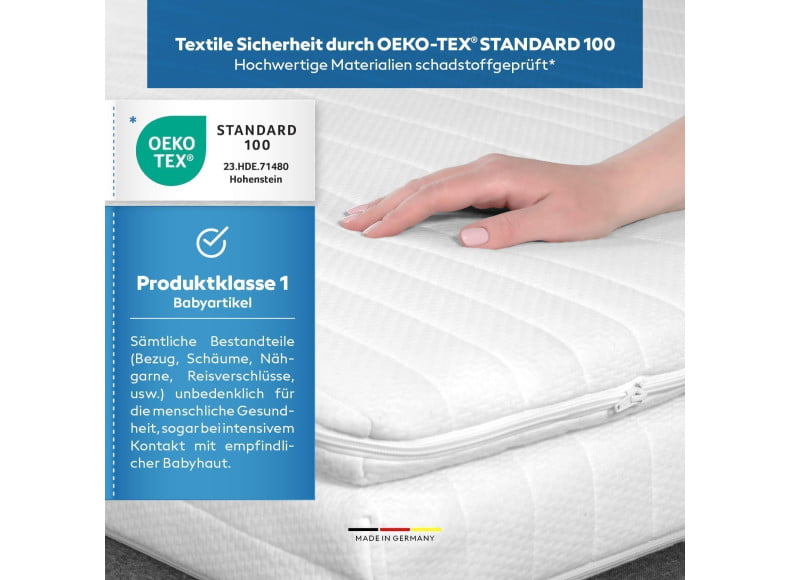 Sämtliche Bestandteile (Bezug, Schäume, Nähgarne, Reisverschlüsse, usw.) unbedenklich für die menschliche Gesundheit, sogar bei intensivem Kontakt mit empfindlicher Babyhaut.