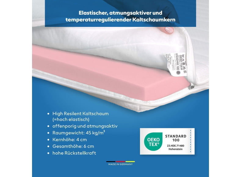 Der hochwertige Kaltschaumkern mit einer Höhe von 4 cm und einem Raumgewicht von RG 45 kg/m³ sorgt für ein mittelfestes Liegegefühl, das Körpergewicht bis 110 kg punktgenau abfedert, ohne zu hart zu wirken.