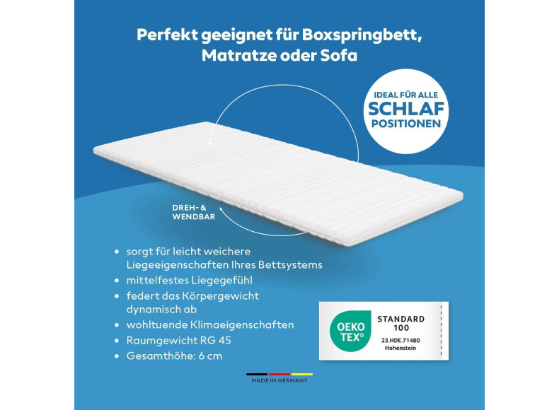 Geeignet für nahezu jedes Bettmodell: Boxspringbett, Matratze, Polsterbett, Schlafsofa, Futonbett, Etagenbett, Seniorenbett u.v.m. Ganz gleich, ob Sie Rücken-, Seiten- oder Bauchschläfer sind – dieser Topper verbessert die Druckverteilung und Liegeeigenschaften spürbar, ohne das ursprüngliche Liegegefühl zu stark zu verändern.