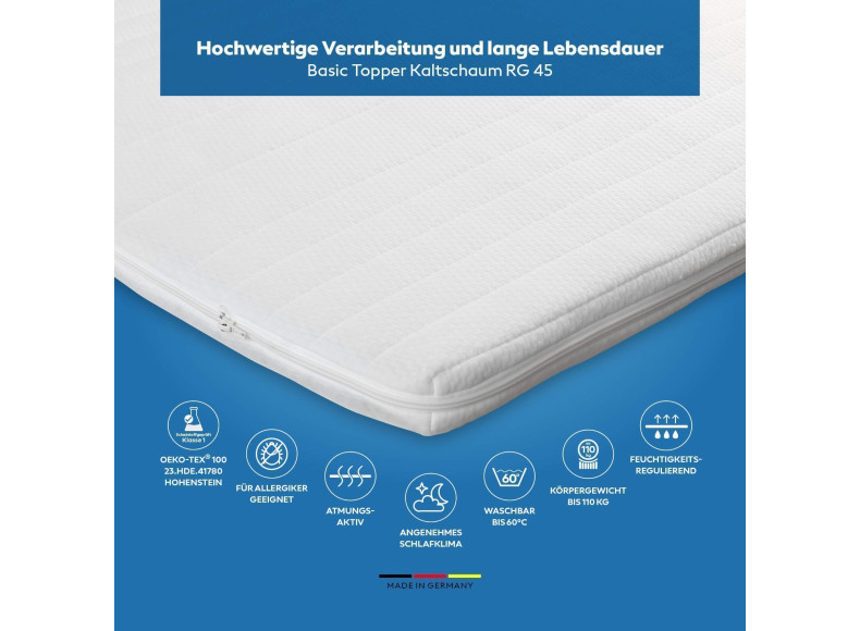 Der hochwertige Kaltschaumkern mit einer Höhe von 4 cm und einem Raumgewicht von RG 45 kg/m³ sorgt für ein mittelfestes Liegegefühl, das Körpergewicht bis 110 kg punktgenau abfedert, ohne zu hart zu wirken.