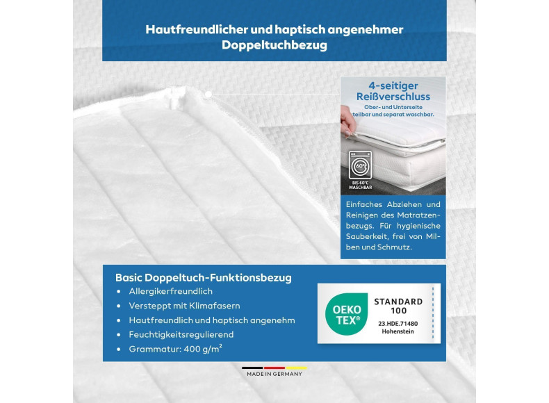 - Jersey Funktions-Doppeltuchbezug (400 g/m²): Atmungsaktiv, feuchtigkeitsregulierend, bis 60°C waschbar (abhängig von der Größe, siehe Datenblatt) und Allergiker geeignet.