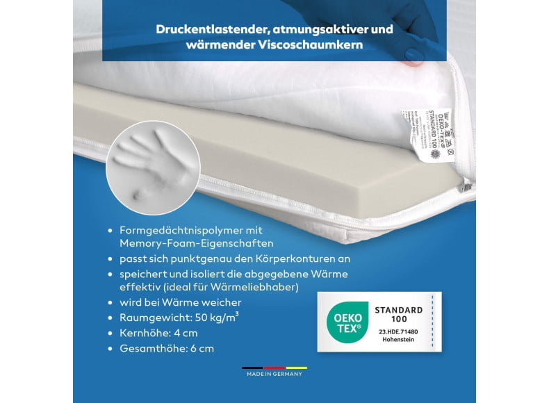 Der 4 cm hohe Viscoschaumkern aus Formgedächtnispolymer mit einem Raumgewicht von 50 kg/m³ bietet einen besonders weichen und körperanpassenden Liegekomfort.